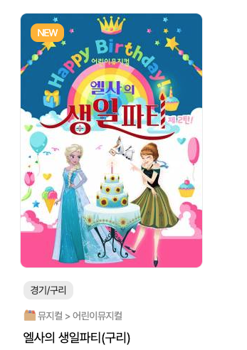 | 엘사의 생일파티(구리) | 2025.03.18~ | 구리 | 경기/구리 | - | 43% | 예매하기 |