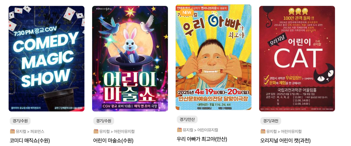 타임티켓에서 제공하는 경기/인천 지역 뮤지컬 공연 정보를 한눈에 확인해보세요. 어린이 마술쇼부터 코미디 매직쇼까지 다양한 장르의 공연을 합리적인 가격에 만나볼 수 있습니다.