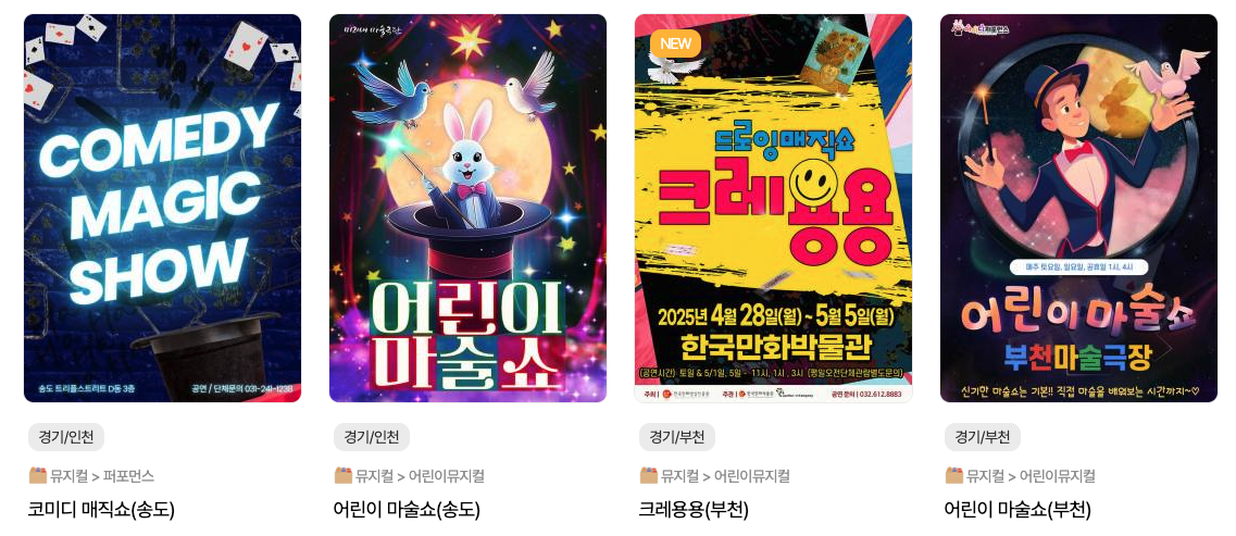 | 어린이 마술쇼(부천) | OPEN RUN | 부천 | 경기/부천 | ★★★★★ (5.0) | 52% | 예매하기 |