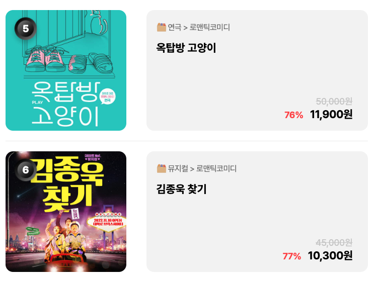 6 김종욱 찾기 뮤지컬 > 로맨틱코미디 2025.02.01 ~ 2025.05.30 대학로 쁘띠첼씨어터 45,000원 → 10,300원 (77% 할인)