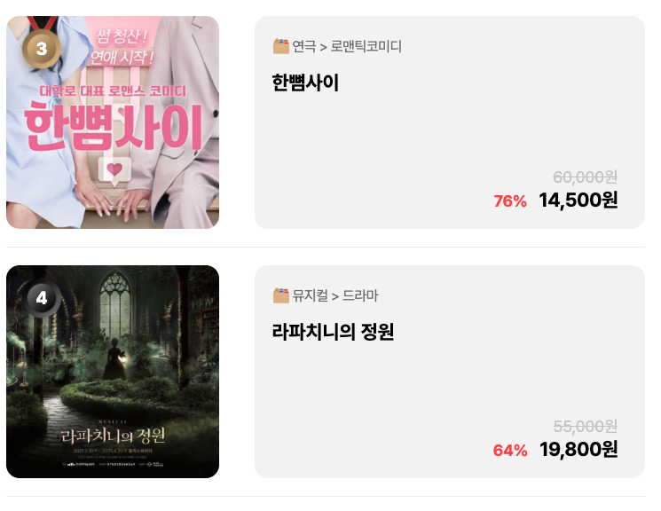 참고: 공연 정보는 2025년 3월 1일 ~ 3월 31일 예매 수량 기준 집계되었습니다. 모든 공연은 파스텔 그린 버튼을 클릭하여 할인된 가격으로 예매 가능합니다.