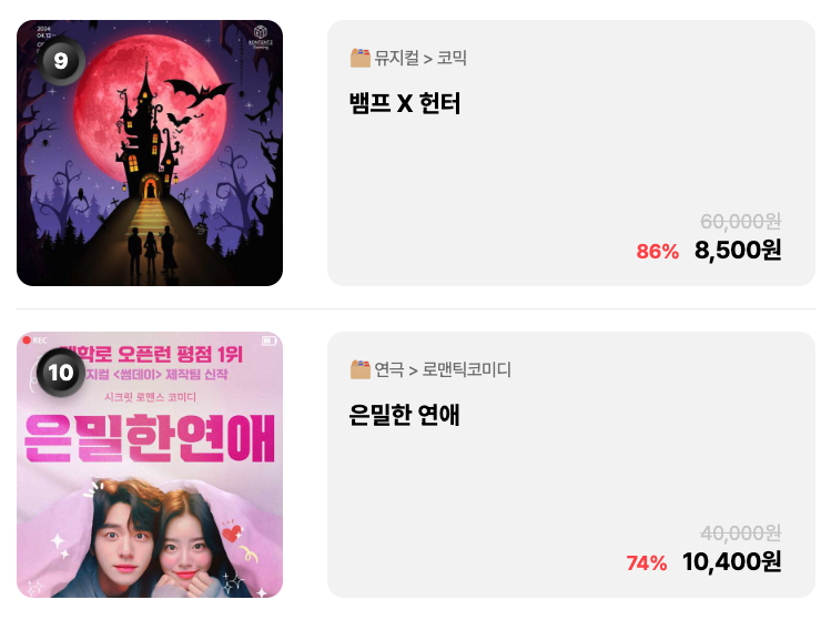 10 은밀한 연애 연극 > 로맨틱코미디 2025.03.15 ~ 2025.06.30 대학로 예그린씨어터 40,000원 → 10,400원 (74% 할인)