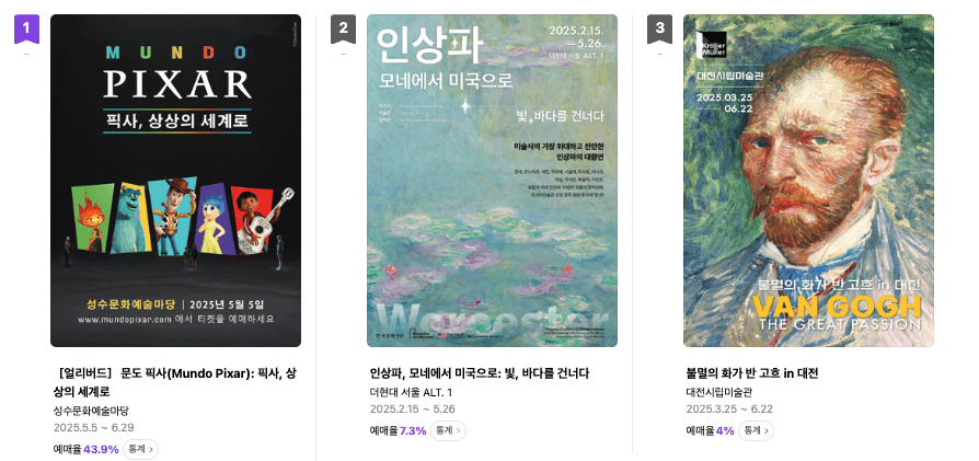 2025년 4월 16일 기준, 인터파크에서 가장 높은 예매율을 기록하고 있는 전시회 3개를 정리했습니다. 희소한 작품과 풍부한 볼거리로 관람객들의 사랑을 받고 있는 전시를 놓치지 마세요.