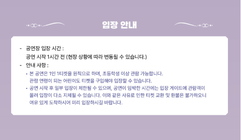 - 입장 시간: 공연 시작 1시간 전부터 입장 가능