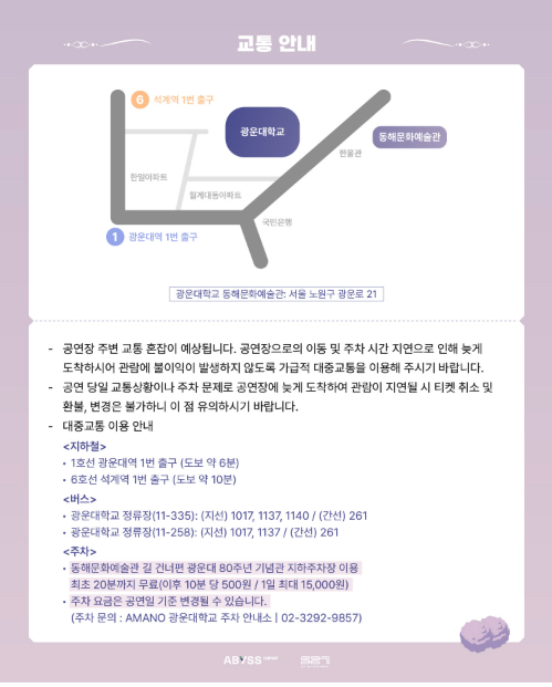 | 주차 | 광운대학교 내 주차장 이용 가능 (유료) 주변 공영주차장 활용 권장 |